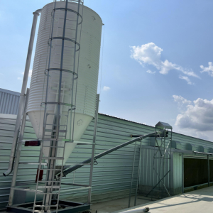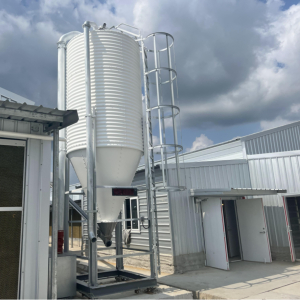 镀锌板料塔,通过下部料斗内轴部组件和螺旋弹簧绞龙旋转送料。主料线通过绞龙运转把饲料输送到鸡舍内的料箱内。在主料线末端电机前方的副料箱落料管位置装有料位传感器实现主料线的自动控制。也可用于塞盘料线的自动送料。