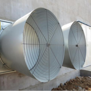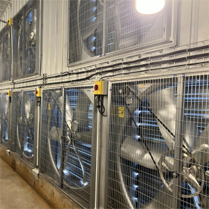 风机用于畜牧养殖场的环境通风降温,风机启动时,百叶窗通过打开机构自动打开,风阻小,整机运行平稳,振动小、噪音低,风量始终如一;停止通电后,百叶窗在重力及拉簧的作用下关闭;风机通常固定在舍内墙体洞口处,风机运行安全可靠,可强力促进空气流动,达到通风降温效果。